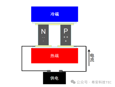 Het principe van halfgeleiderkoeling (Peltier-effect): wanneer stroom door het contactoppervlak tussen p-type en n-type halfgeleidermaterialen stroomt, migreren de dragers en absorberen ze warmte om koeling te bereiken (koude kant), terwijl warmte aan de andere kant vrijkomt (hete kant)