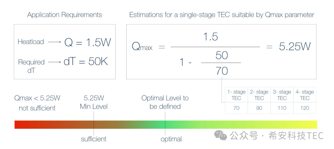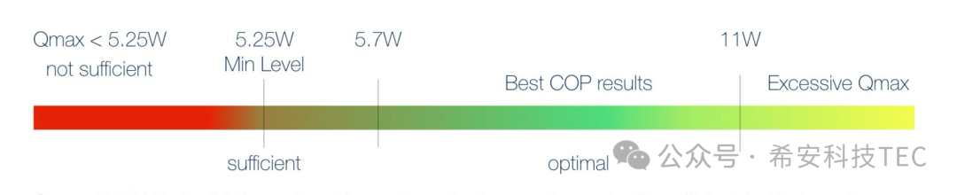 De kernvereisten voor TEC-selectie: belasting Qc, bedrijfstemperatuur Tc, hot end-temperatuur Th, Dt=Th-Tc. Bijvoorbeeld: Qc=1,5W, Dt=50K, Qmax=1,5(1-50/70)=5,25W. Is deze Qmax 5,25W de optimale oplossing? Nee, 5,25 is de kleinste Qmax in deze toepassing. Qmax is niet noodzakelijkerwijs hoe groter hoe beter. Als het groter is, zal het aantal PN-paren groter zijn en zal de verbruikte energie zelf groter zijn. Het berekenen van deze optimale Qmax is nogal ingewikkeld en vereist zeer professionele thermische ontwerpingenieurs.