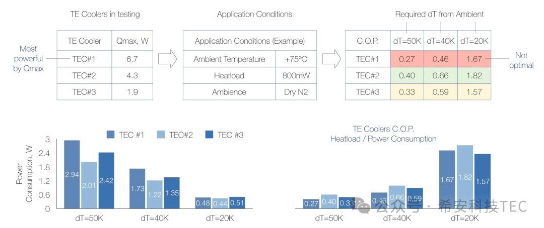 Zoals weergegeven in de volgende afbeelding hebben we drie groepen TEC geselecteerd, verschillende Qmax, maar dezelfde applicatieomgeving. De COP van TEC# 1 is het laagst, terwijl de Qmax het grootst is.